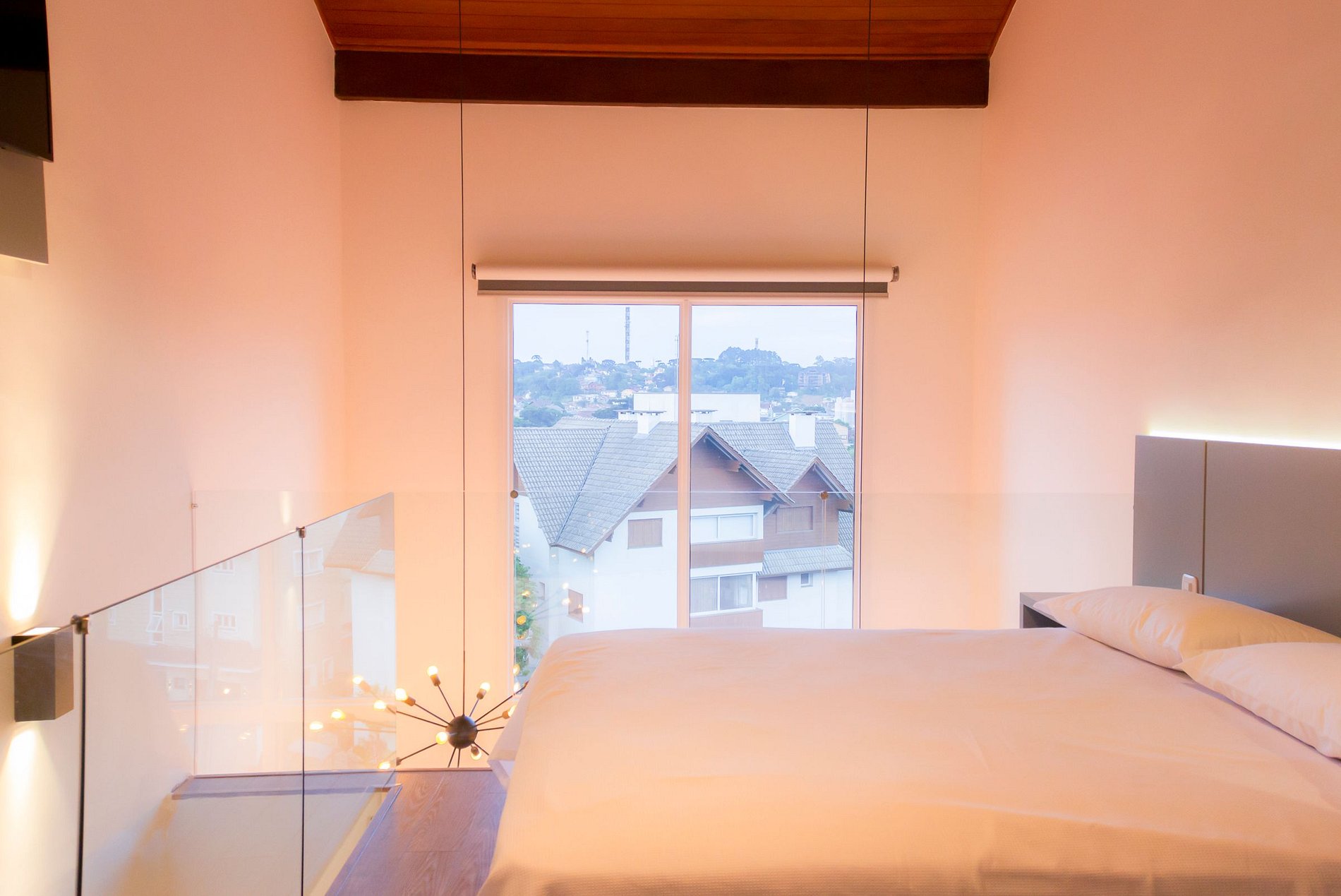 Sua estadia será ainda mais especial, nesse aconchegante loft em um dos prédios mais charmosos no centro Gramado. A sala com pé-direito duplo, integrada ao mezanino e à varanda com churrasqueira, fazem desse espaço uma experiência singular.
