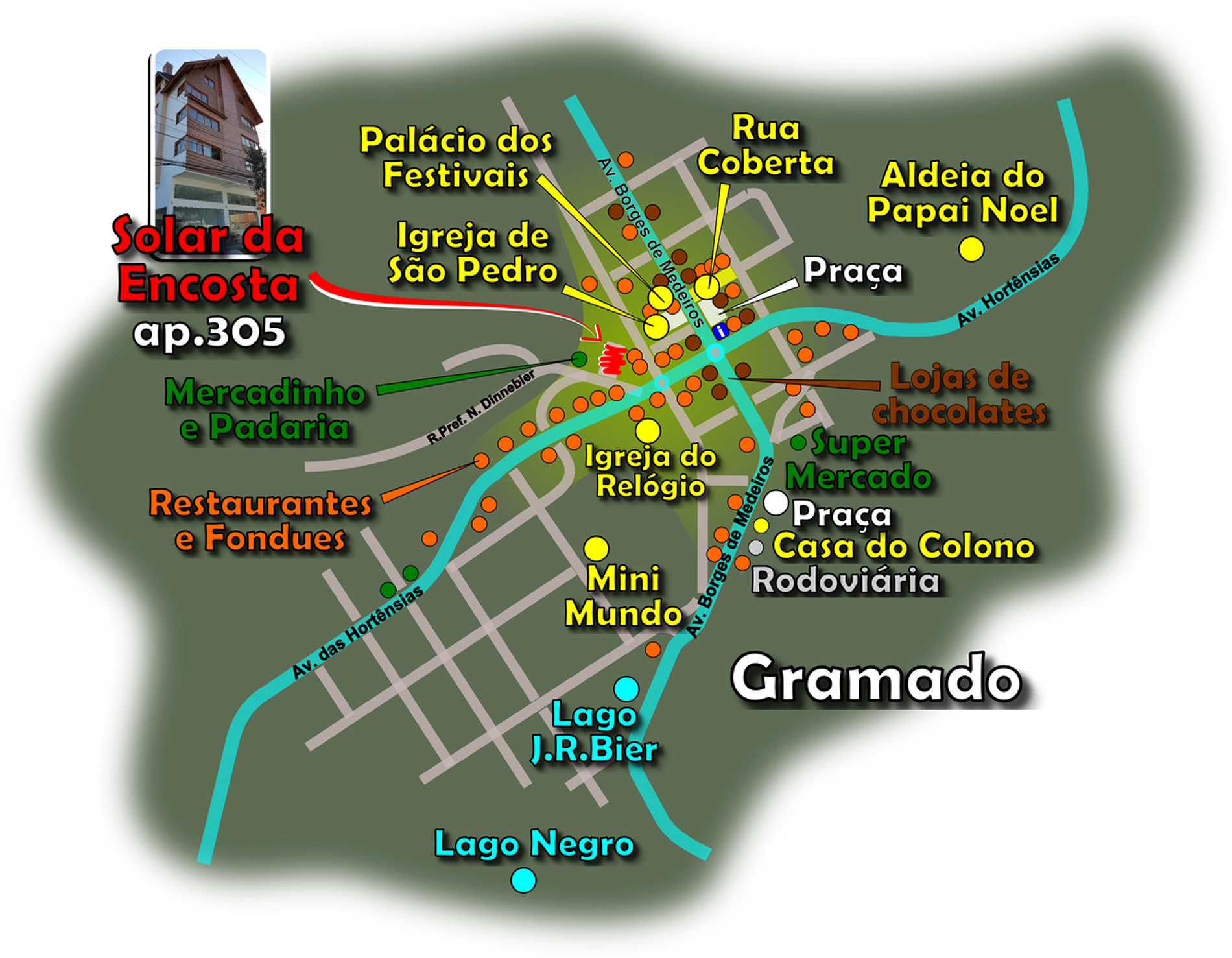 A localização é excelente. A poucos passos do Le Challet e os principais restaurantes e fondues na Av. das Hortênsias. A 200m da Borges de Medeiros, coração da cidade, onde estão a Igreja de São Pedro, a Rua Coberta e o Palácio dos Festivais. A 50m do edifício tem um mercadinho onde encontrará tudo que precisa para sua alimentação durante a estadia.